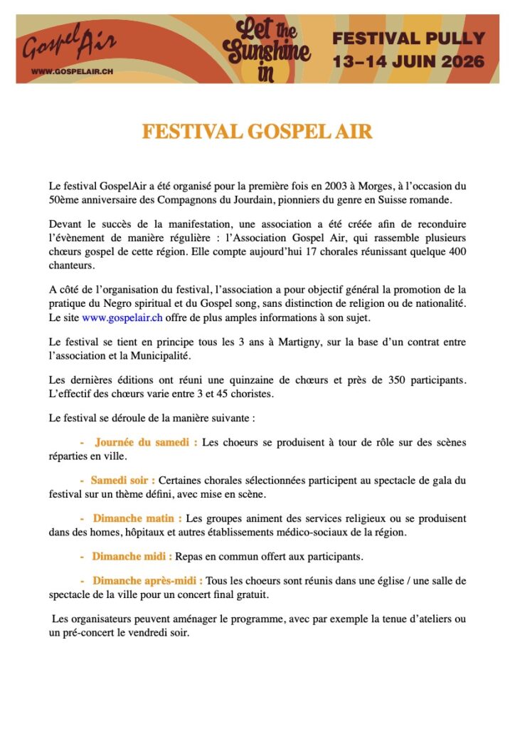 Vous êtes intéressé(e) à venir au Gospel Air 2026 ? Dans l’image ci-dessous, vous trouverez les informations principales qui vous seront utiles, en complément du site officiel du Gospel Air.